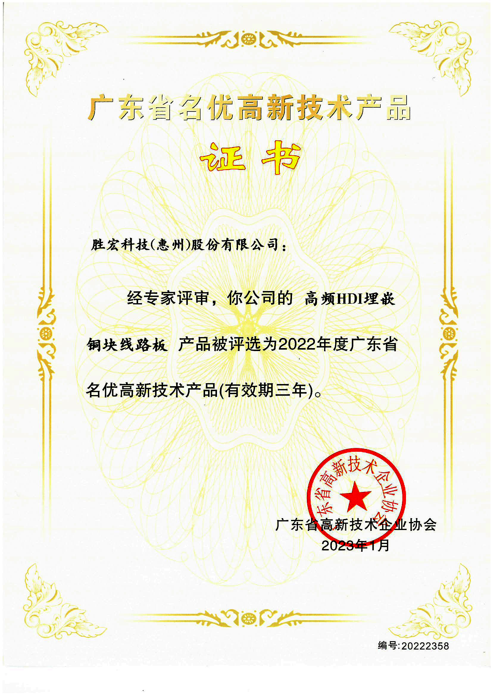 “高頻HDI埋嵌銅塊電路板”名優(yōu)高新技術(shù)產(chǎn)品證書