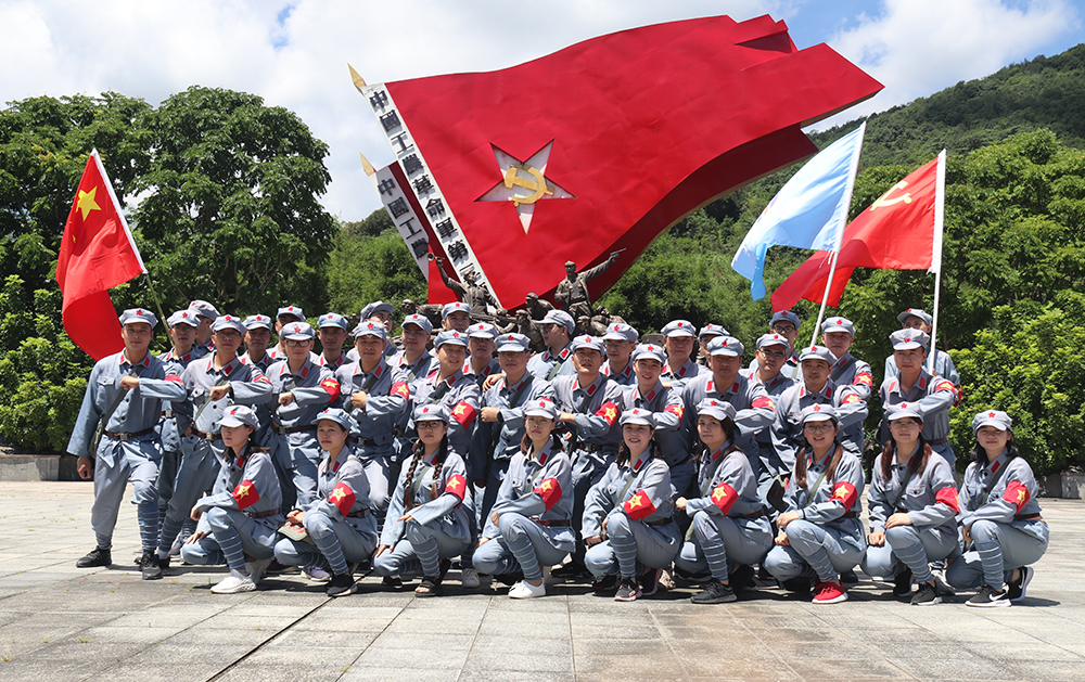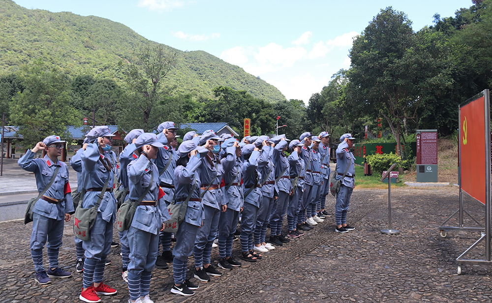 經(jīng)過3個(gè)小時(shí)的車程,黨員們到達(dá)了有著“東江紅都”之稱的高潭鎮(zhèn)。炙熱的陽光助漲了大家的熱情,換上統(tǒng)一紅軍裝后,在組織委員張斌的帶領(lǐng)下,大家隊(duì)列整齊,唱著激昂的歌曲,喊著響亮的口號(hào),踏著堅(jiān)定的步伐走過馬克思街和列寧街,馬克思街和列寧街是中國最早以共產(chǎn)主義領(lǐng)導(dǎo)人名命名的街道,是極具歷史意義“紅色印記”。緊接著,大家來到烈士紀(jì)念碑前,在莊嚴(yán)肅靜的氛圍中,聽從教官統(tǒng)一指揮,向烈士敬獻(xiàn)花籃、默哀悼念、撫今追昔、緬懷先烈。